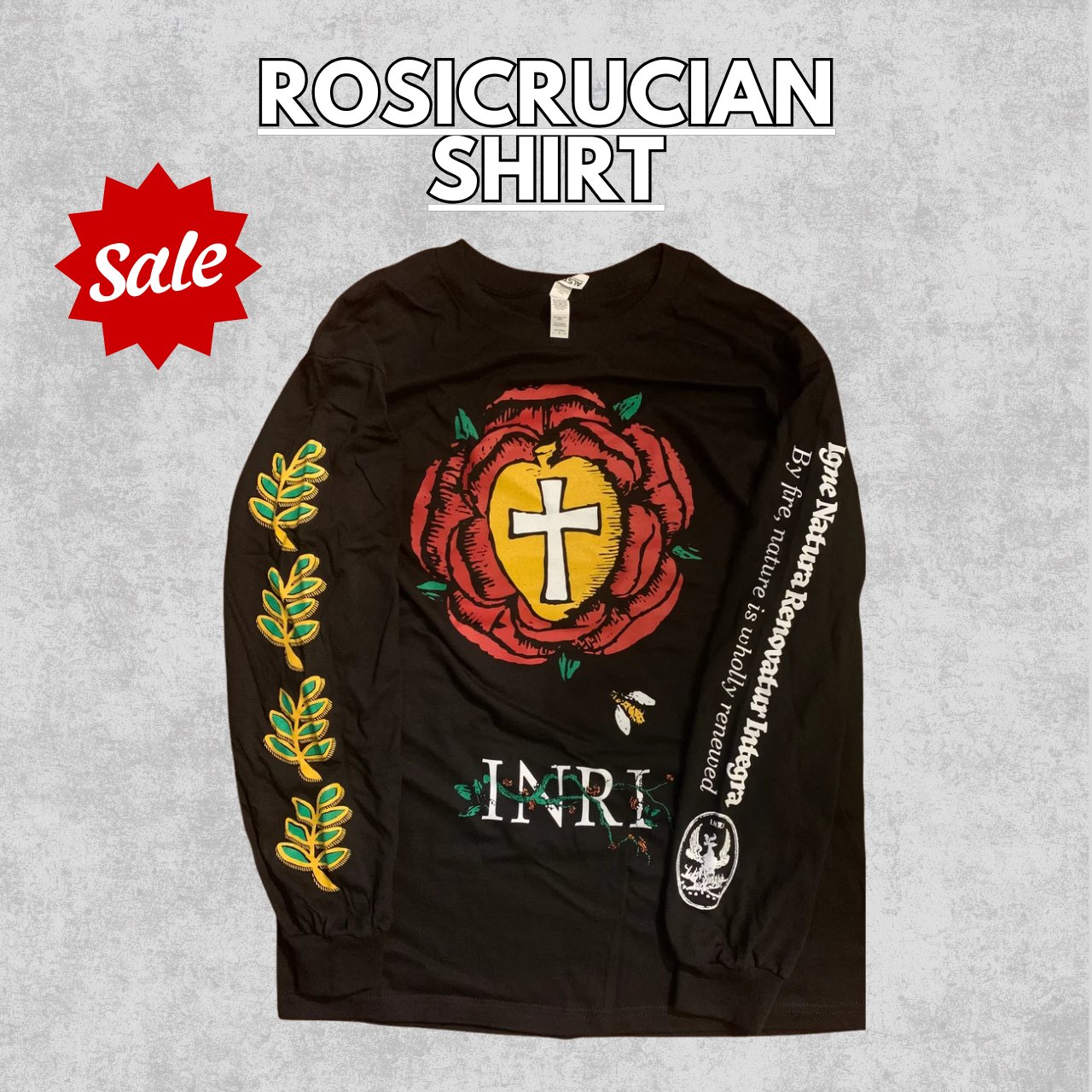 This shirt features symbolism from Rosicrucianism, alchemy, and Freemasonry. The rose-cross on the front is an old Rosicrucian emblem and depicts the Trinity of Spirit, Soul, Body. The acacia leaf on the side is from Freemasonry and represents the immortality of the Soul. The Phoenix represents death and rebirth - as does the acronym INRI. Comes with an 8-page pamphlet with more information on this symbolism.